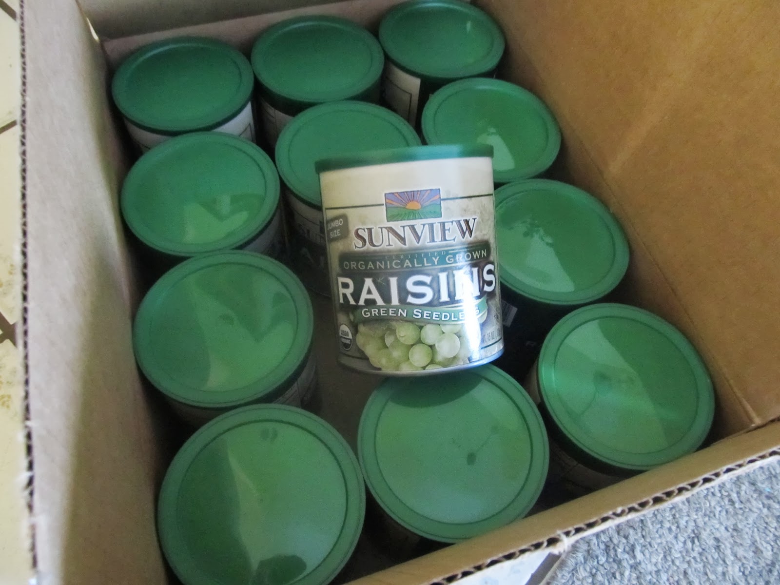 Today we got a box in the mail...earlier than I expected it...from Sunview company in Delano. California! Hooray! These are ORGANIC; And everyone knows grapes are one of the most heavily sprayed fruits in the country. That is why I no longer buy any other raisins but organic ones. Why I like these ((I always order the green seedless variety because I prefer the taste compared to red seedless)is because they are huge! And yummy!